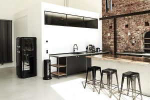 Die offenen Küche, die teilweise freien Ziegelsteinwände und die offene Designerküche hinter der Stahlschiebeswand geben der Location das besondere Etwas.
