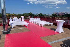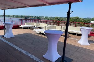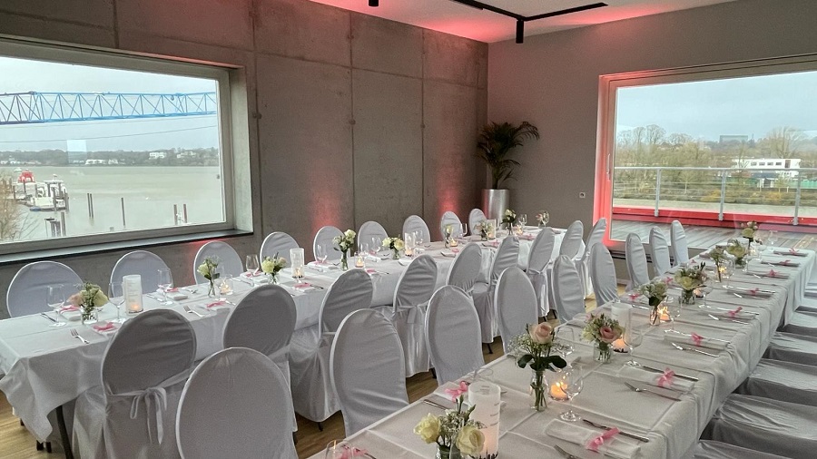 Zwei Terrassen stehen für Sektempfänge, BBQs und freie Trauungen zur Verfügung und bieten einen grandiosen Blick auf die Elbe.