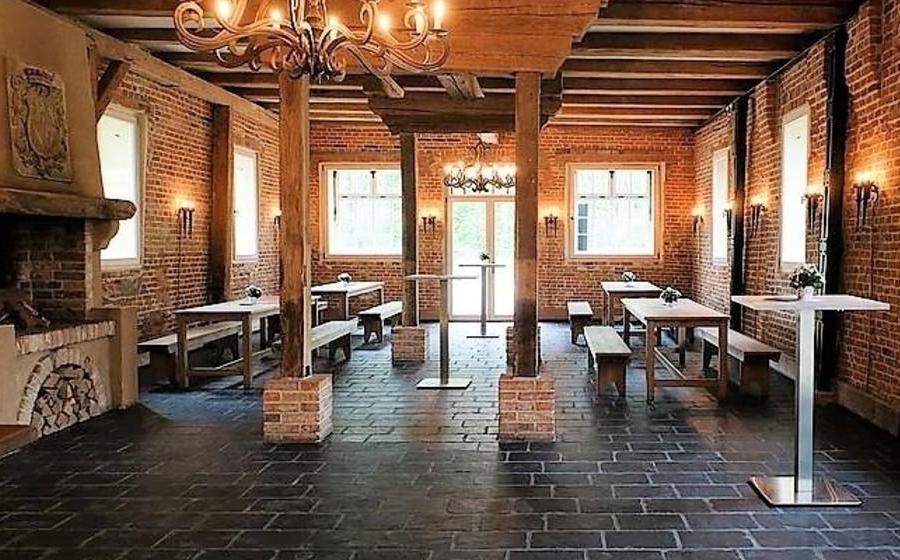 Im Erdgeschoß können bis zu 80 Gäste Platz finden. Es kommt entweder rustikalen Holzbänke oder moderne Bankettbestuhlung zum Einsatz. Die Holzbalkenkonstruktion und ein eingebauter Tresen sowie ein steinerner Kamin sorgen für behagliche Atmosphäre im Raum.