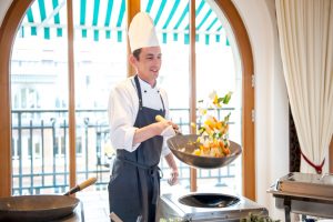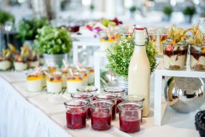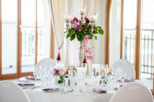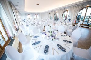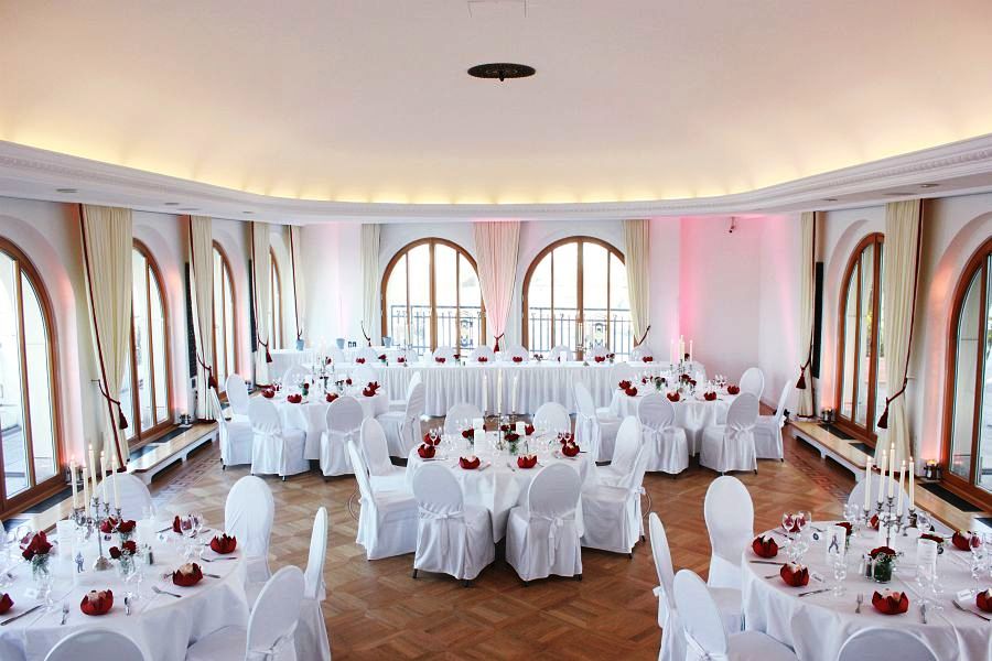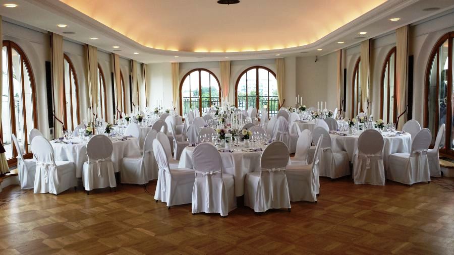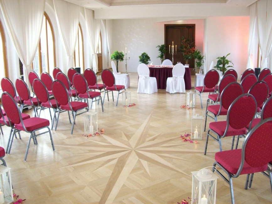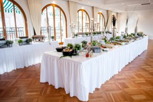 Das Buffet wird in einem extra Saal aufwendig aufgebaut. Von hier aus kommen Ihre Gäste auch später auf die Innenterrasse. Aufgrund seiner Großzügigkeit können auch hier freie Trauungen durchgeführt werden.
