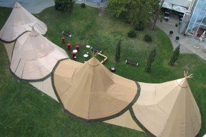 Jedes Zelt hat eine Grundfläche von 13 x 13 Meter (Nutzfläche 10 x 10 Meter) und bietet je nach Aufteilung und Ausstattung Platz für 40-100 Personen. Die Zelte können ineinander gebaut werden. Dadurch können Zeltlandschaften von 10 - 1.000 Personen geschaffen werden.