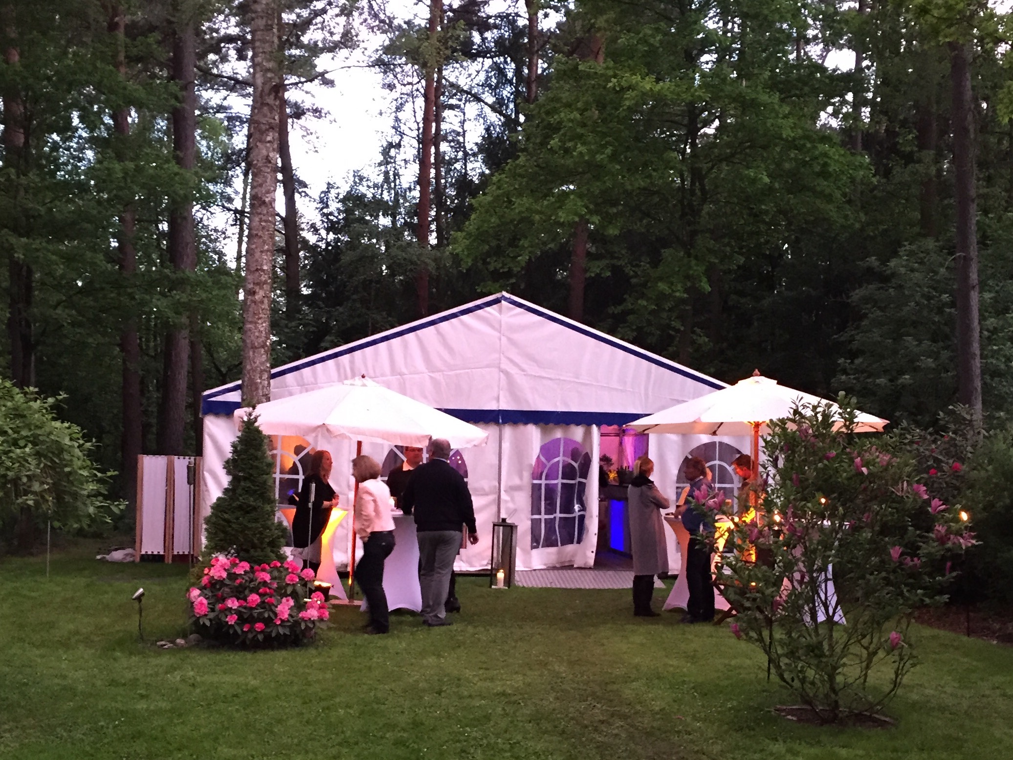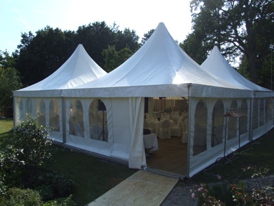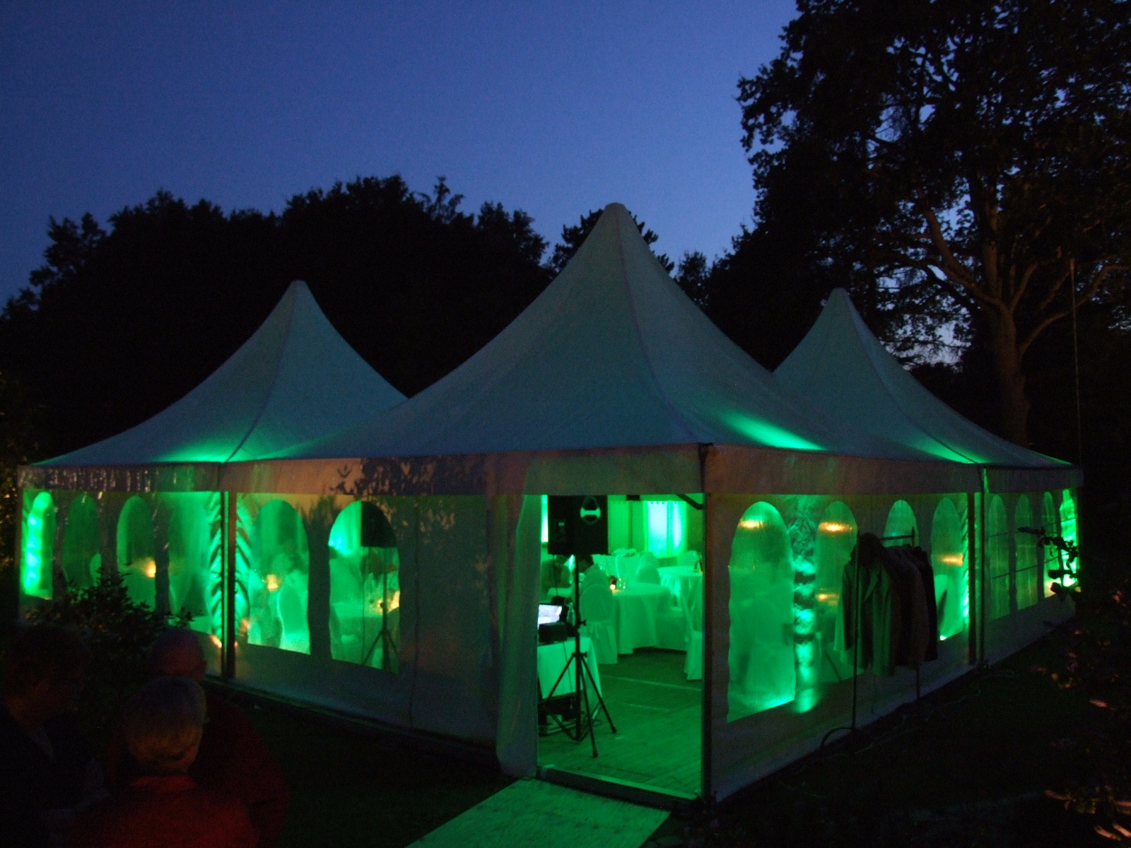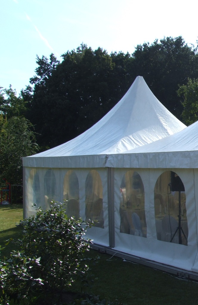 Unabhängig zu Hause im Garten in Pagodenzelten feiern: Die Zelte haben eine Grundfläche von 5 x 5 m können in jeder Richtung individuell vergrößert werden. Sie sind mit festen Holzböden ausgestattet. Auch die Wände sind frei mit und ohne Fenster einsetzbar.